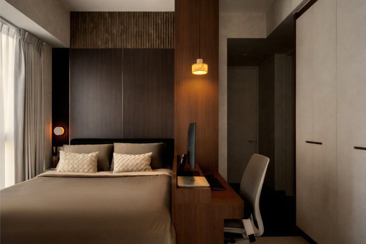 The homeowner approached me with a vision of quiet luxury. He wanted an upscale sanctuary where he could work, unwind, and recharge. What emerged is a serene, yet sophisticated retreat tailored for a professional bachelor. Grounded in thoughtful feng-shui principles, the layout encourages harmony, clarity, and an effortless flow between spaces. Every element is intentionally curated to balance refinement with restraint, resulting in a home that feels calm, elevated, and deeply personal.